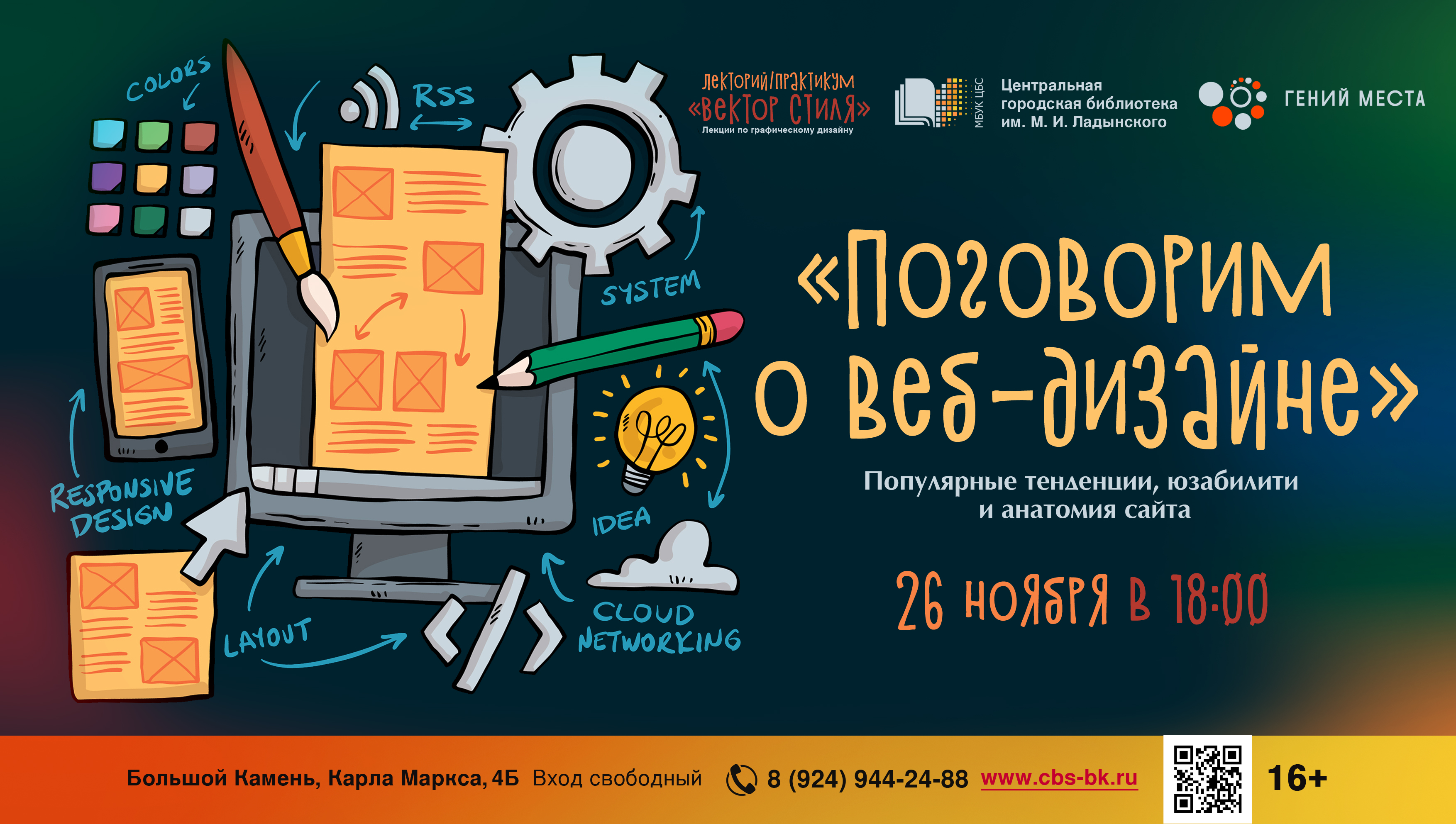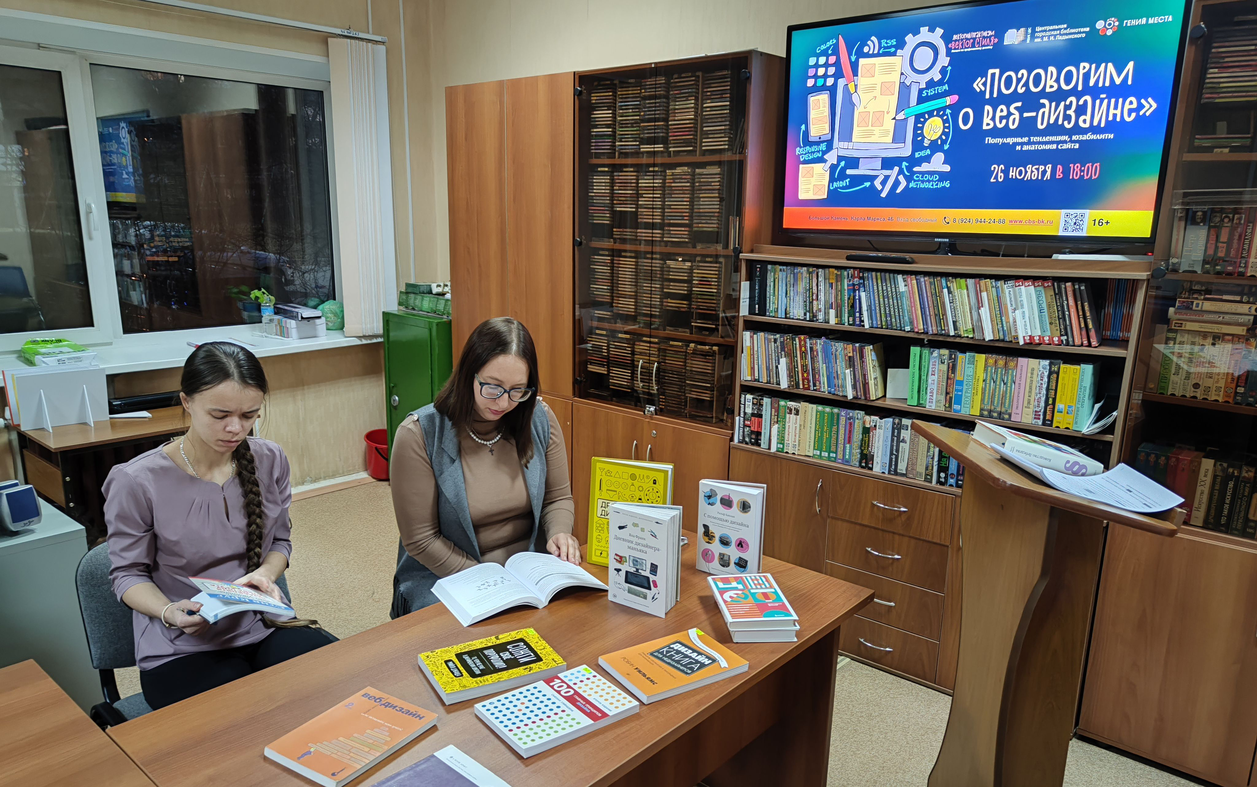 26 ноября в 18:00 в Центральной городской библиотеке им. М. И. Ладынского прошла восьмая лекция по графическому дизайну «Вектор стиля» (в рамках федерального проекта «Придумано в России» по созданию точек концентрации талантов «Гений места»).