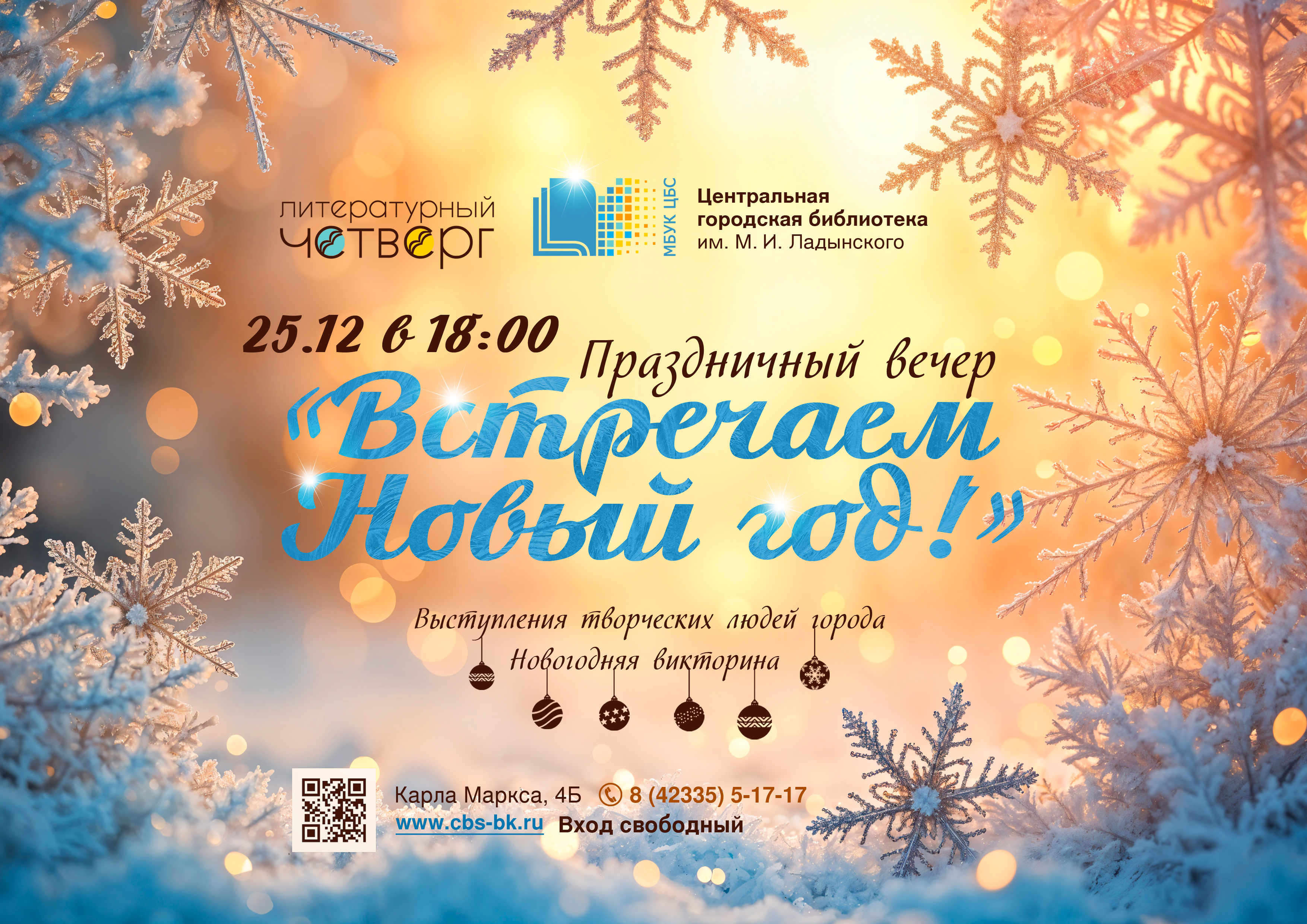 Дорогие друзья! Приглашаем вас на праздничный вечер "Встречаем Новый год!" в любительском объединении "Литературный четверг". В программе: выступление творческих людей города и новогодняя викторина. Мероприятие состоится 25 декабря в 18:00 в Центральной городской библиотеке им. М.И. Ладынского. Вход свободный.