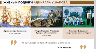 Адмирал и святой праведный воин Федор Федорович Ушаков – пример выдающегося служения России. 24 февраля 2025 года исполняется 280 лет со дня рождения Фёдора Фёдоровича Ушакова – великого русского флотоводца, адмирала, командующего Черноморским флотом, причисленного Русской Православной Церковью к лику святых. 17 февраля, для учащихся СОШ № 1, проведён информационный час «Что значит служить Отечеству?» в рамкам программы «Разговоры о важном». Фёдор Фёдорович Ушаков – адмирал, который внёс огромный вклад в развитие российского военно-морского флота. Он был основателем русской тактической военно-морской школы, благодаря чему не потерпел ни одного поражения в 43 морских боях. Ребята познакомились с биографией адмирала, рассмотрели сцены морских сражений адмирала Ф.Ф. Ушакова на картинах современных художников-маринистов, обсудили видеосюжет о знаменательном событии русско-турецкой войны 1787-1791 гг. - победе русской эскадры под командованием Ф.Ф. Ушакова над турецкой эскадрой у мыса Тендра и узнали, что этот день объявлен Днем воинской славы России. Адмирал и святой праведный воин Федор Федорович Ушаков – пример выдающегося служения России. Каждый, кто заботится об общественном благе, регулярно совершает достойные и честные поступки, служит Отечеству. Федор Федорович Ушаков – один из символов воинской славы России, пример мужества, преданности Отечеству и высокого профессионализма.