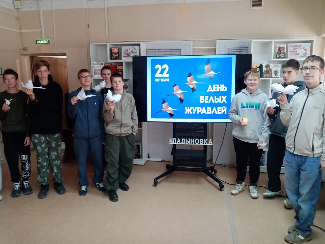 28 октября в Центральной городской библиотеке им. М.И. Ладынского прошел патриотический час «Белые журавли» для учеников 7 "Г" класса СОШ № 4. Ребята познакомились с историей праздника «День белых журавлей". А также ответили на вопросы тематической викторины «Белые журавли». Участники мероприятия с интересом прослушали стихотворение «Журавли» Р. Гамзатова, которое впоследствии стало известной песней. Ученики узнали много нового о журавле, как символе добра и о поверьях, связанных с этой птицей у разных народов мира. В конце мероприятия был проведен мастер-класс по изготовлению бумажных журавлей.
