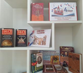 Так же участники познакомились с книжной выставкой «В единстве народа – сила страны», на которой представлены книги о главных вехах в истории нашего государства, о знаменитых россиянах, прославивших свою Отчизну, о знаменательных событиях, сплотивших русский народ в единую силу. Литература, представленная в экспозиции, поможет узнать немало нового и интересного о нашей стране: от географического положения до достопримечательностей отдельных городов и обычаев проживающих в России народов. Здесь найдут свое место и книги о четырехсотлетней истории самого Дня народного единства, об освобождении Москвы от польских интервентов силами народного ополчения.